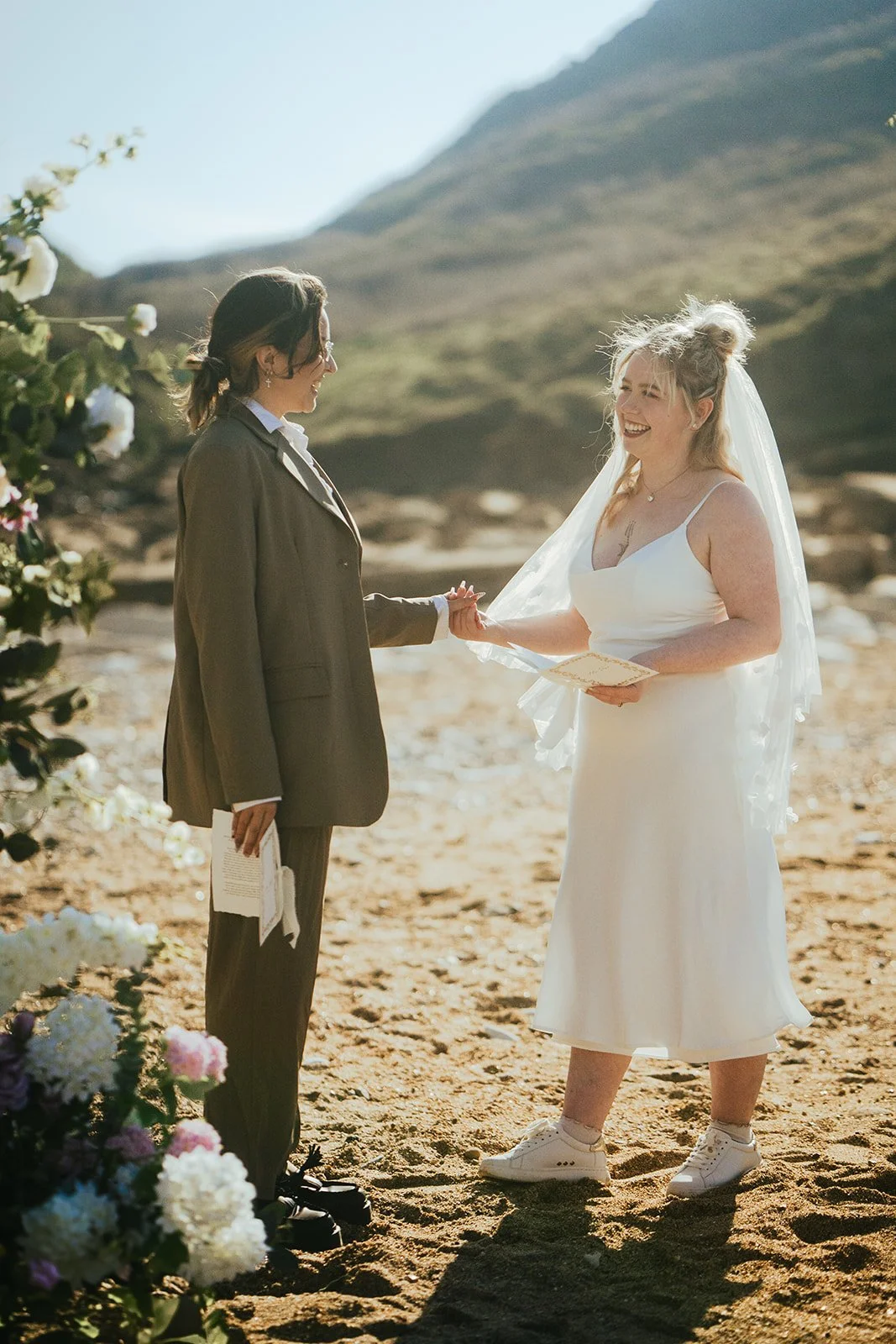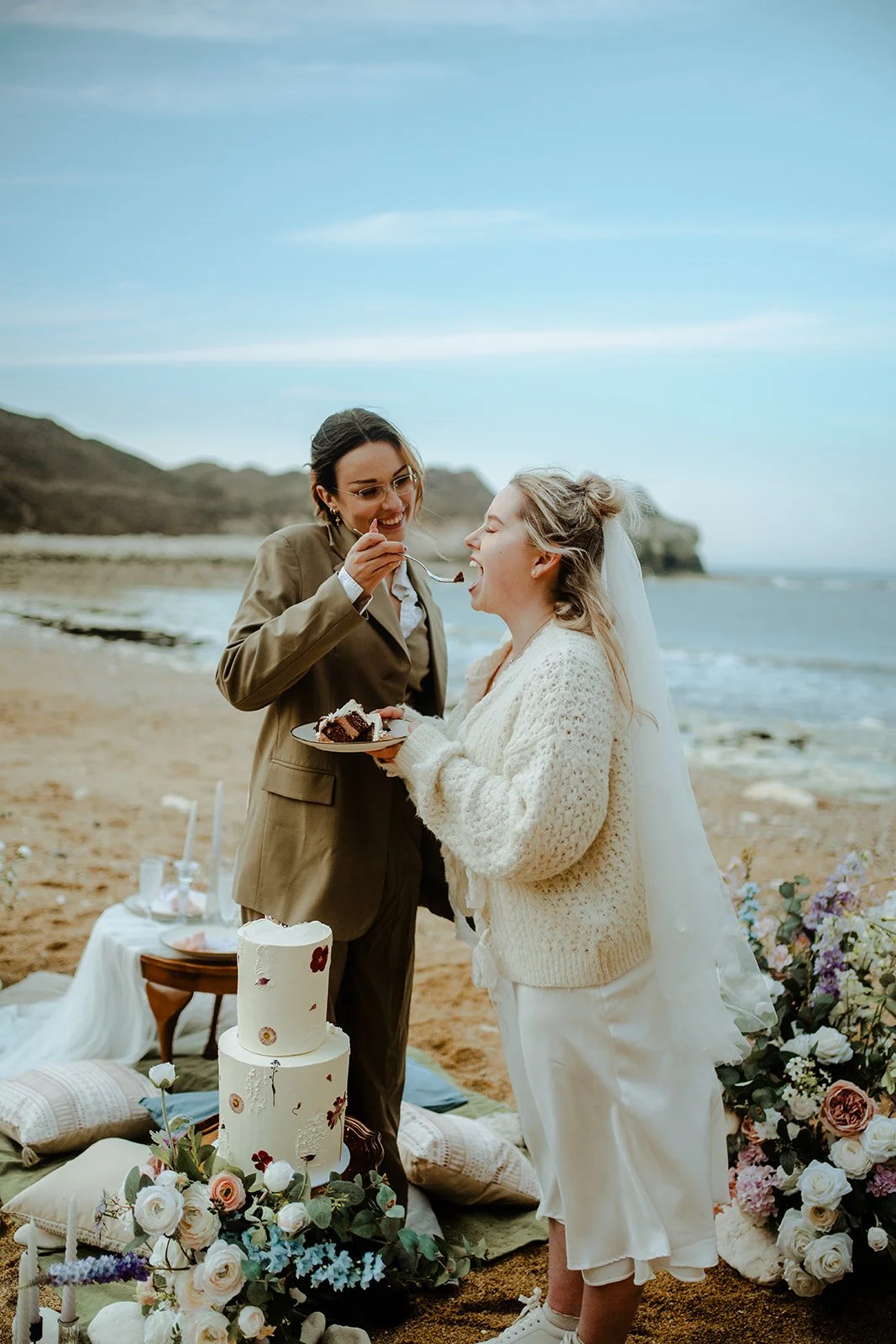 This beautiful elopement shoot took place at Thornwick Bay, Yorkshire, and we were blessed with clear blue skies and sunshine - although it was still a bit chilly, being on a beach in the middle of March in the North of England! But Jenna and Cat were absolutely brimming with love for each other, and we were all warmed by it. It was a pleasure to lead a mini ceremony for them.