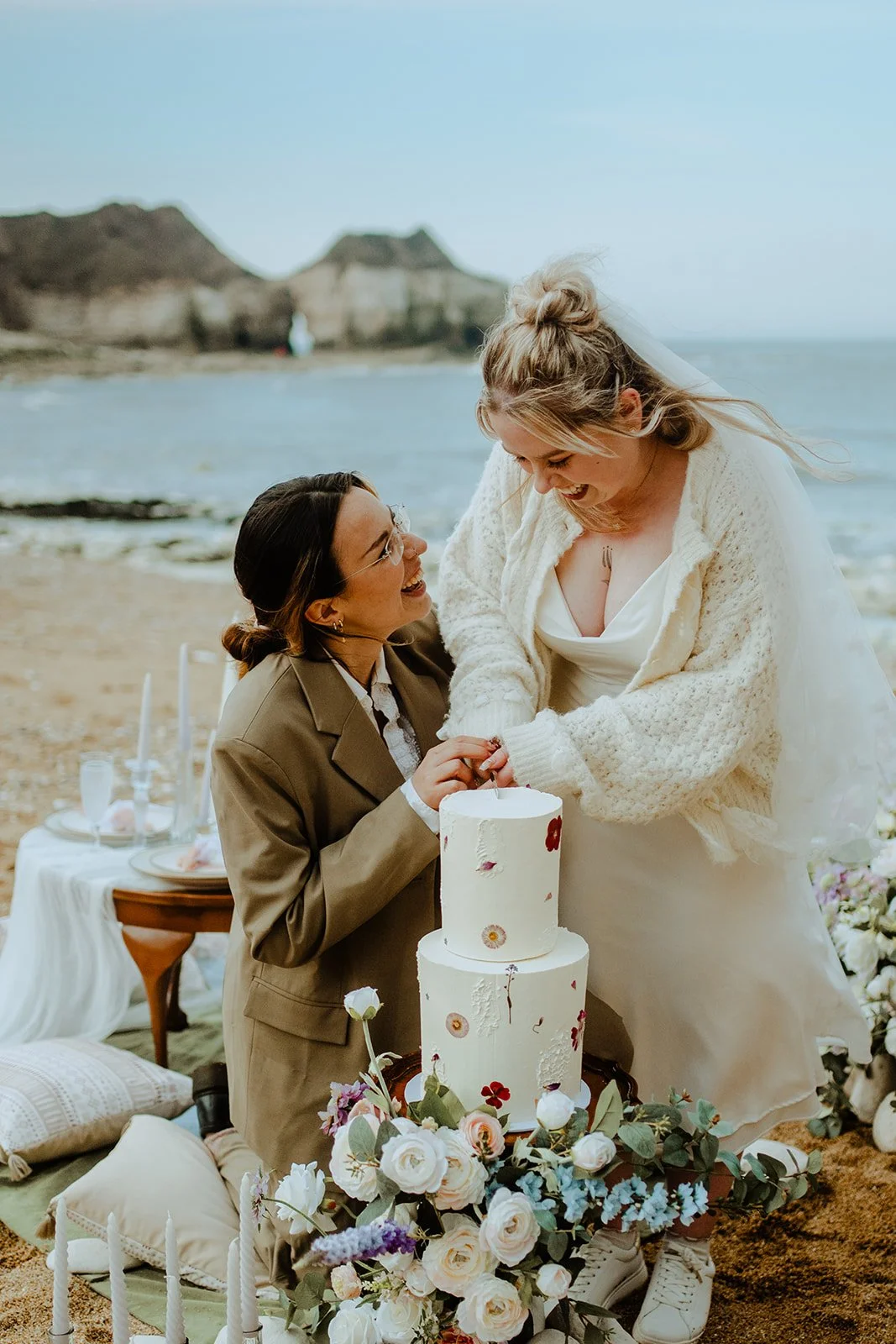 This styled shoot was created by a whole group of wonderfully talented and extremely dedicated suppliers! (Special shout-out to Doina @uniq.decor.florist, who admirably lugged all her boxes and boxes of flowers and decor down the uneven path to the bay from the cliffs and then back up again, and Hannah @hannahskitchenleeds who carried her cake safely down the same!)