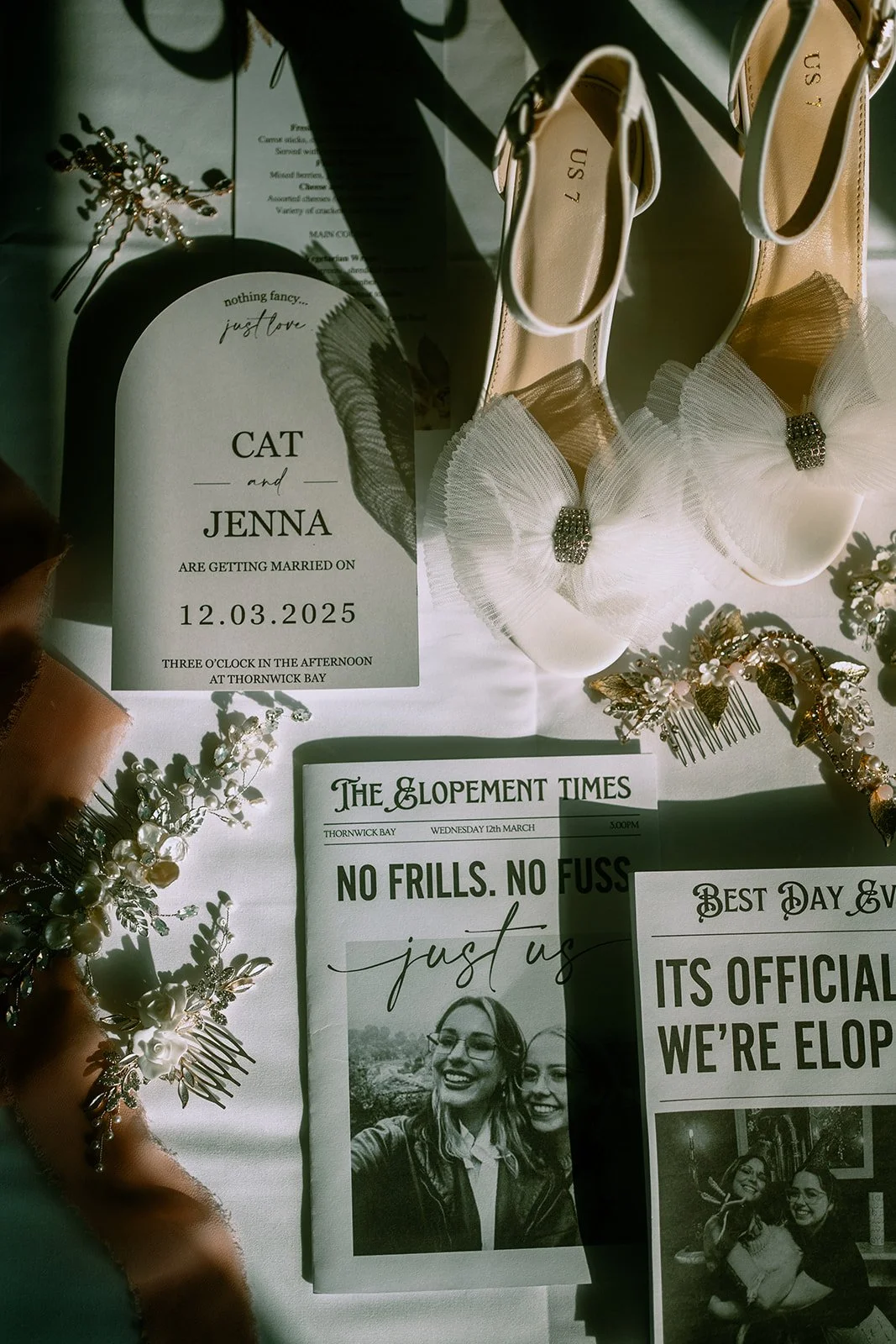 Details: elopement stationery, headpieces and jewellery, and bespoke banner